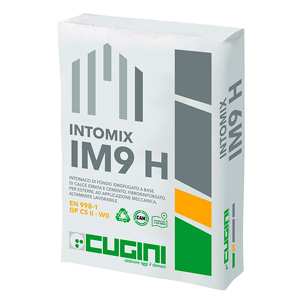 INTOMIX IM9 H è una malta premiscelata a secco, composta da: calce idrata, cemento Portland, sabbie selezionate ed additivi per migliorare la lavorabilità, l’adesione e renderlo idrofugo. Il prodotto è conforme alla norma UNI EN 998-1 ed è classificato come GP CS II - W0.