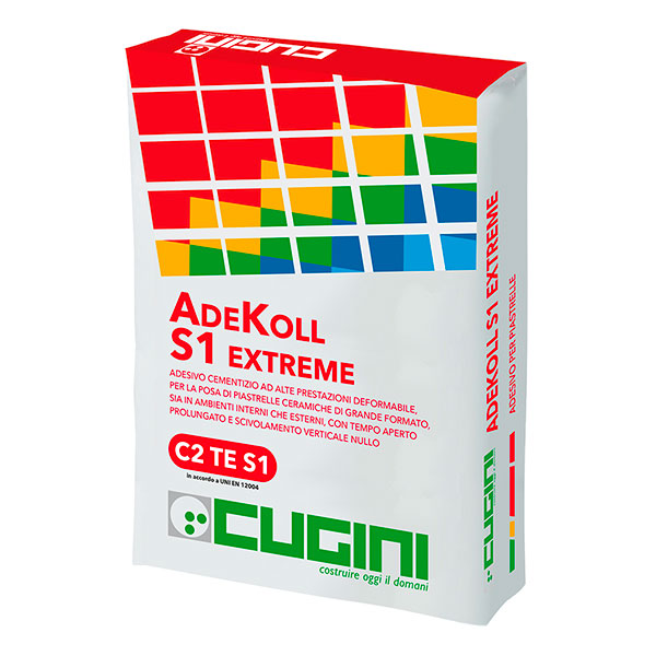 ADEKOLL S1 EXTREME è un premiscelato in polvere, composto da: cemento portland, sabbie silicee di origine fluviale e specifici additivi atti a migliorare la lavorabilità, la flessibilità e l’adesione al supporto. Il prodotto è di colore grigio, ma può essere fornito anche nella versione bianca: ADEKOLL S1 EXTREME B.