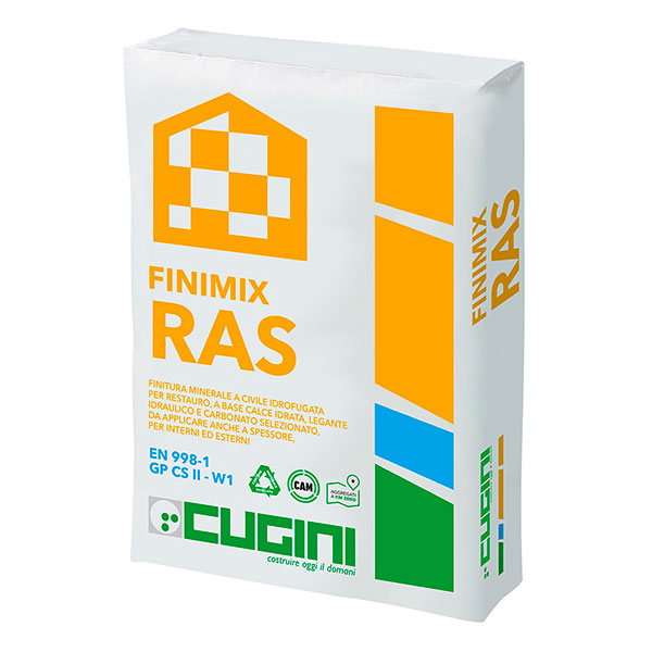 FINIMIX RAS è una malta premiscelata a secco composta da calce idrata, cemento, sabbie carbonatiche selezionate, resine ed additivi che migliorano l’adesione, l’elasticità e la protezione agli agenti atmosferici. Il prodotto è conforme alla normativa UNI EN 998-1 ed è classificato come malta per intonaco di finitura GP CS II - W1.