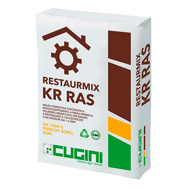 RESTAURMIX KR RAS è una malta premiscelata a secco, composta da: cemento portland ad alte prestazioni, cariche inorganiche a reattività pozzolanica, aggregati selezionati ed additivi specifici per migliorare la lavorabilità, compensare il ritiro idraulico e conferire tixotropia. Il prodotto contiene inoltre un idrorepellente silano-silossanico, che garantisce un’ottima protezione dagli eventi atmosferici, lasciando inalterata la permeabilità alla diffusione del vapore nella muratura. RESTAURMIX KR RAS è un rivestimento indicato per regolarizzare e proteggere superfici di calcestruzzo o di muratura che presentino i primi segni di degrado o con imperfezioni esecutive (vespai, vuoti, armature con scarso copriferro, ecc). Il prodotto possiede un’elevata adesione ed elasticità, oltre a resistere all’azione del gelo e disgelo e alla penetrazione di agenti aggressivi, dell’acqua, dell’anidrite carbonica, ecc.