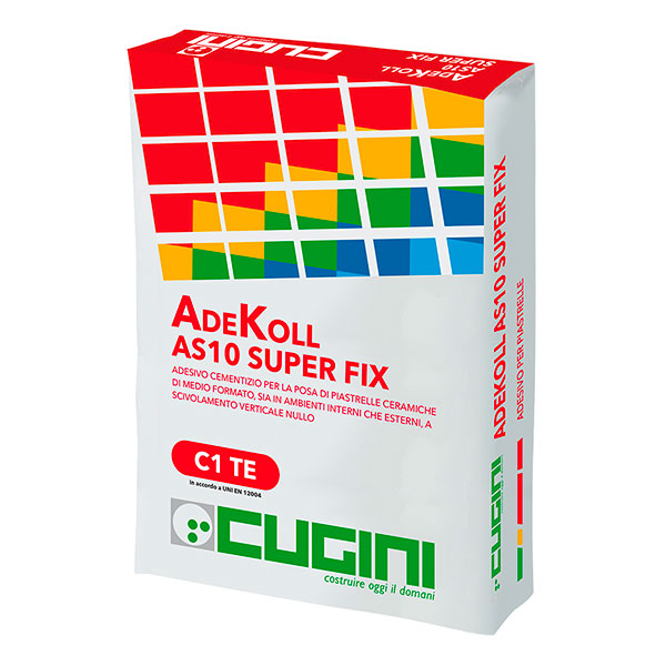 ADEKOLL AS10 SUPER FIX è un premiscelato in polvere, composto da: cemento portland, sabbie silicee di origine fluviale e specifici additivi atti a migliorare la lavorabilità, la flessibilità, l’adesione al supporto e prolungare il tempo aperto. L’adesivo è conforme alla normativa UNI EN 12004 è classificato come C1 TE.