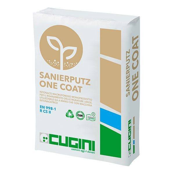 SANIERPUTZ ONE COAT è una malta premiscelata a secco di colore grigio chiaro, a base di sabbie selezionate, inerti leggeri di origine minerale, fibre, additivi, calce idrata, legante idraulico bianco ad attività pozzolanica che conferisce un’incrementata resistenza all’attacco chimico (solfati, piogge acide, ecc.) rispetto alle normali malte. L’intonaco è caratterizzato da alta porosità, elevata permeabilità al vapore acqueo e basso assorbimento d’acqua, in accordo a quanto previsto dagli standard WTA per gli intonaci deumidificanti. L’intonaco è conforme alla norma UNI EN 998-1 ed è classificato come R CS II. Il prodotto è utilizzato per il risanamento di murature vecchie o recenti, degradate dall’umidità di risalita capillare, o per applicazioni in bioedilizia.